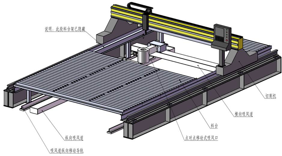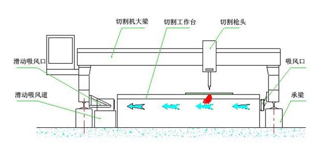 側(cè)吸式煙塵凈化系統(tǒng)采用吸風(fēng)口固定在切割機(jī)龍門架上,吸風(fēng)口與吸風(fēng)道之間通過密封皮帶密封,吸風(fēng)口可隨龍門架在吸風(fēng)道上來回移動(dòng)吸風(fēng),將切割的粉塵吸除。