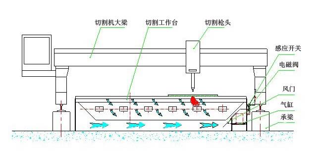 下吸式煙塵凈化系統(tǒng)抽風(fēng)是通過下吸式抽風(fēng)切割臺(tái)來實(shí)現(xiàn)的,下吸式抽風(fēng)切割臺(tái)分成若干個(gè)區(qū)域,每個(gè)區(qū)域設(shè)計(jì)有風(fēng)門吸風(fēng),切割槍頭在每個(gè)區(qū)域切割時(shí),相應(yīng)區(qū)域的風(fēng)門打開抽風(fēng),將切割機(jī)的粉塵吸除。
