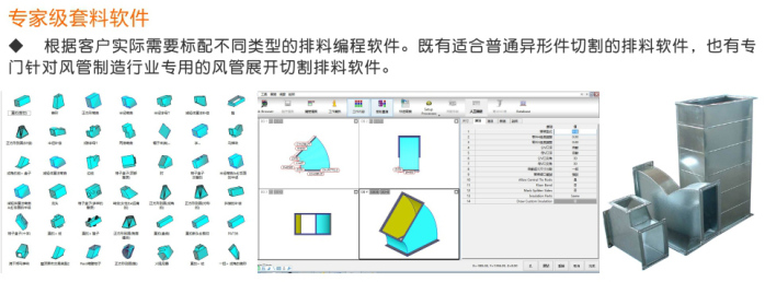 3.對于鈑金或風(fēng)管展開切割用戶:本設(shè)備可與金林鈑金、CAM-DUCT、Lantek等風(fēng)管行業(yè)專用軟件實現(xiàn)無縫對接,用戶只需在軟件中選擇鈑金件樣式、輸入簡單的參數(shù),即可自動生成展開件、自動排料、自動生成切割程序,然后調(diào)入到數(shù)控切割機中進(jìn)行切割加工,使鈑金切割工作更便捷、更高效。